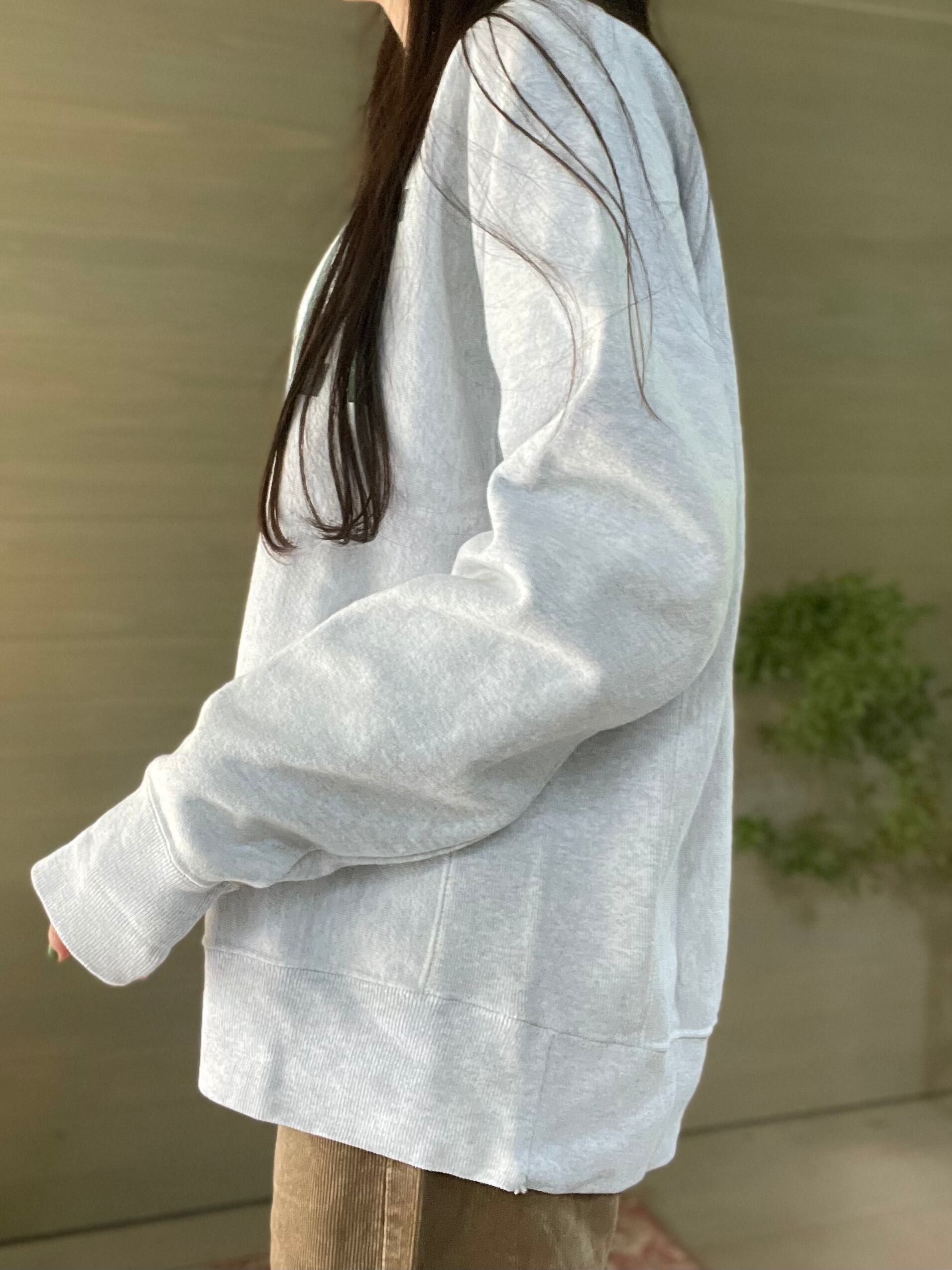 "Champion"リバースウィーブの染み込みプリントのスウェットです。プリントのかすれ具合に味が出ていて古着らしさを引き立たせてくれます。合わせやすい霜降りがかったグレーでスタイリングも自由自在です。