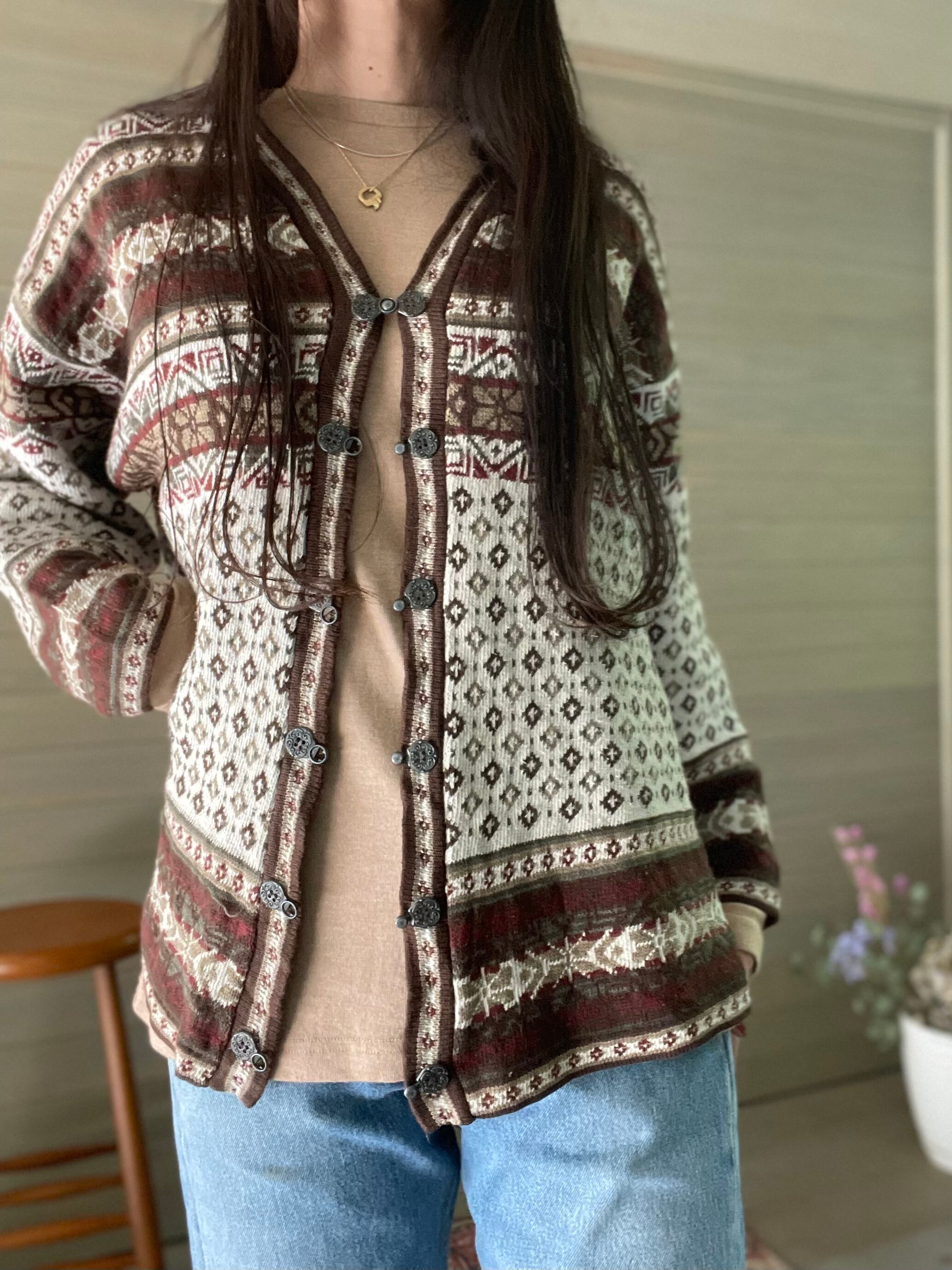 ブラウンベースが落ち着いた印象のチロリアンニットです。身幅もゆったりとしていて柔らかい生地なので堅苦しくならずにさらりと羽織れます。コーデュロイパンツに合わせたらワンピースの上に羽織ってもアクセントになる1枚です。